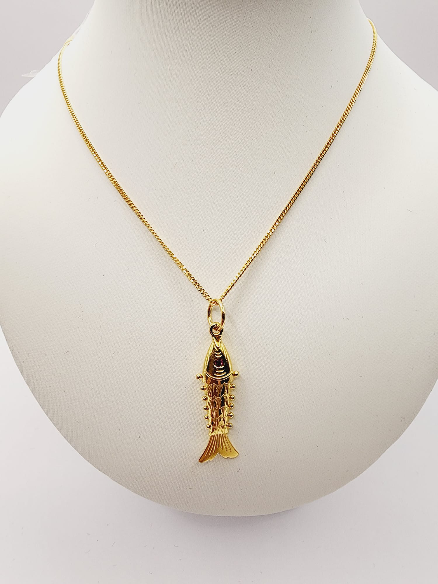 Experience the luck and magic of the 916 Gold Fish Pendant. This stunning pendant is crafted with quality 916 gold and features a playful fish design. Embrace the positive energy and abundance associated with goldfish and add a touch of whimsy to your jewellery collection.