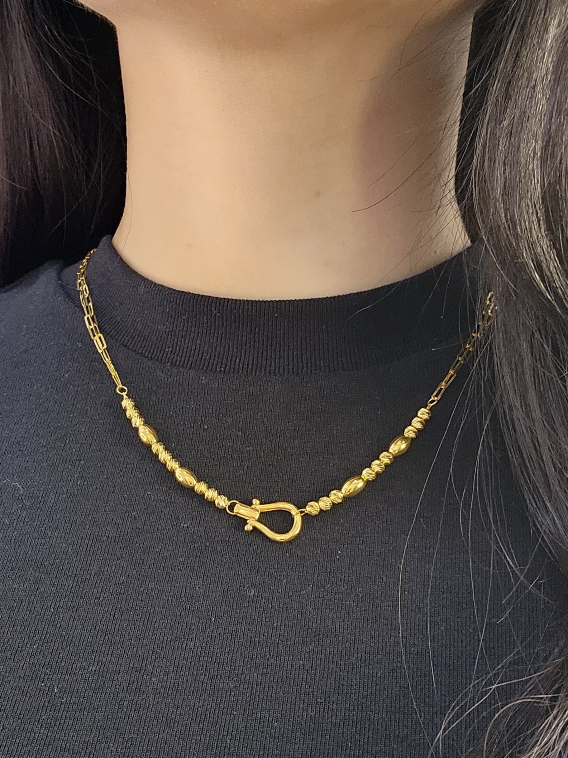 This 916 Gold Horseshoes Bead Chain is the perfect accessory for anyone looking to add a touch of luck and style to their wardrobe. Made of high-quality 916 gold, this chain features horseshoe-shaped beads that not only add visual interest but also symbolize good luck and fortune. Upgrade your jewelry collection today with this unique and meaningful piece.