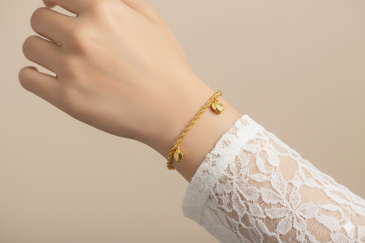 Crafted from 916 gold, this stunning Love Dangling Rope Bracelet adds a touch of elegance to any outfit. The intricate rope design symbolizes the strength and interconnectedness of love, while the dangling charm adds a playful touch. Perfect for any occasion, this bracelet is a must-have for any jewelry collection.