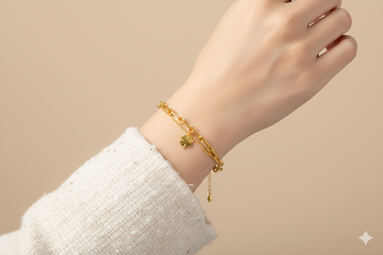 Elevate your everyday elegance with this stunning 916 Gold Two Layer Flower Link Bracelet. Crafted from quality 916 gold, this piece features delicate flower-shaped links arranged in two graceful layers, creating a sophisticated and feminine design. The layered construction adds dimension and visual interest to your wrist, making it perfect for both casual wear and special occasions. Whether you're dressing up for an event or adding a touch of refinement to your daily look, this bracelet brings timeless beauty and charm to any outfit.